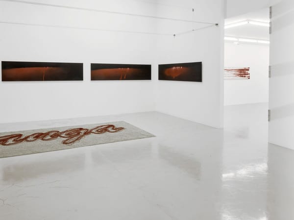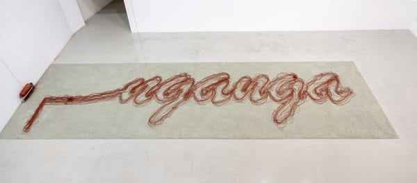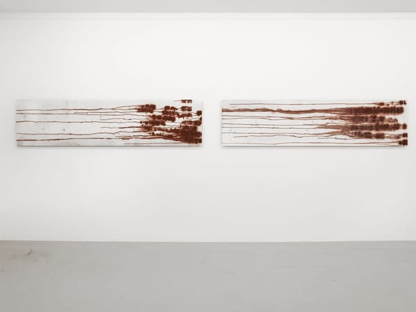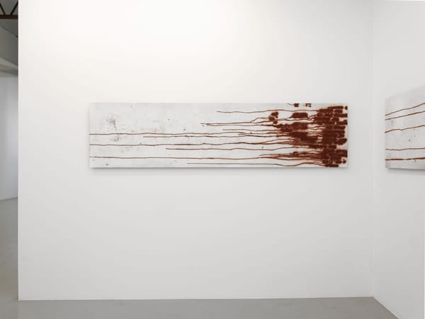 Robert Andrew Residues: buru, nagala, ngan-ga 2021, Ochre, oxides, acrylic paint, chalk on board, Six panels: 60.5 x 244 cm each4 / 13