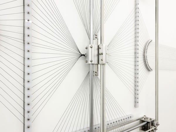 Robert Andrew Data Stratification - ngan-ga (detail) 2021, Rocks, branches, pearl shell, thread, electromechanical device and acrylic conduits, Dimensions variable9 / 13