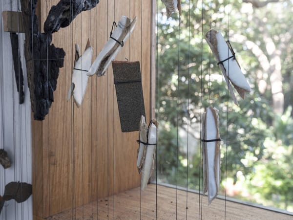Robert Andrew Data Stratification - ngan-ga (detail) 2021, Rocks, branches, pearl shell, thread, electromechanical device and acrylic conduits, Dimensions variable8 / 13