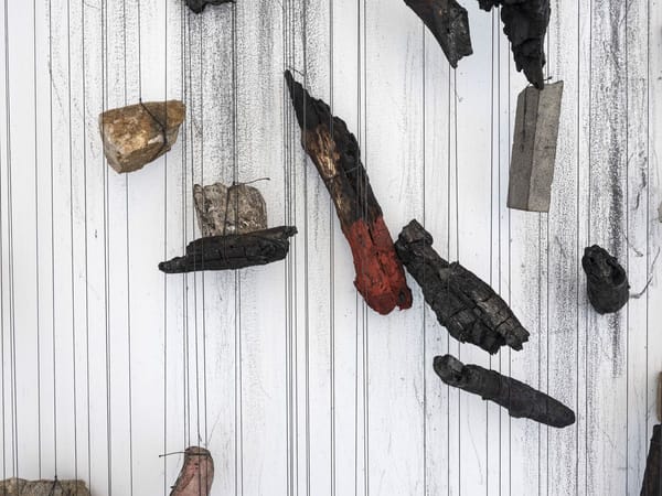 Robert Andrew Residues: buru, nagala, ngan-ga (detail) 2021, Ochre, oxides, acrylic paint, chalk on board, Six panels: 60.5 x 244 cm each3 / 13