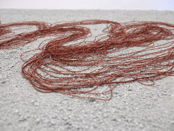 Robert Andrew Continuing Depths of Connection - ngan-ga (detail) 2021, Ochre, oxide, string, electromechanical device, granite chips, Dimensions variable13 / 13