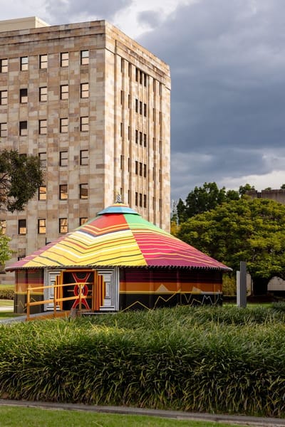 Yuriyal Bridgeman’s monumental installation SUNA (Middle Ground) 2020 is a beacon for storytelling, idea-sharing, and connection. Represented on the front lawn of the University of Queensland Art Museum is a raun haus (traditional Papua New Guinea Highlands round house) that is the artist’s home and the heart of Bridgeman’s extended family, the Yuri Alaiku tribe and his renowned practice in the Waghi Valley in PNG.